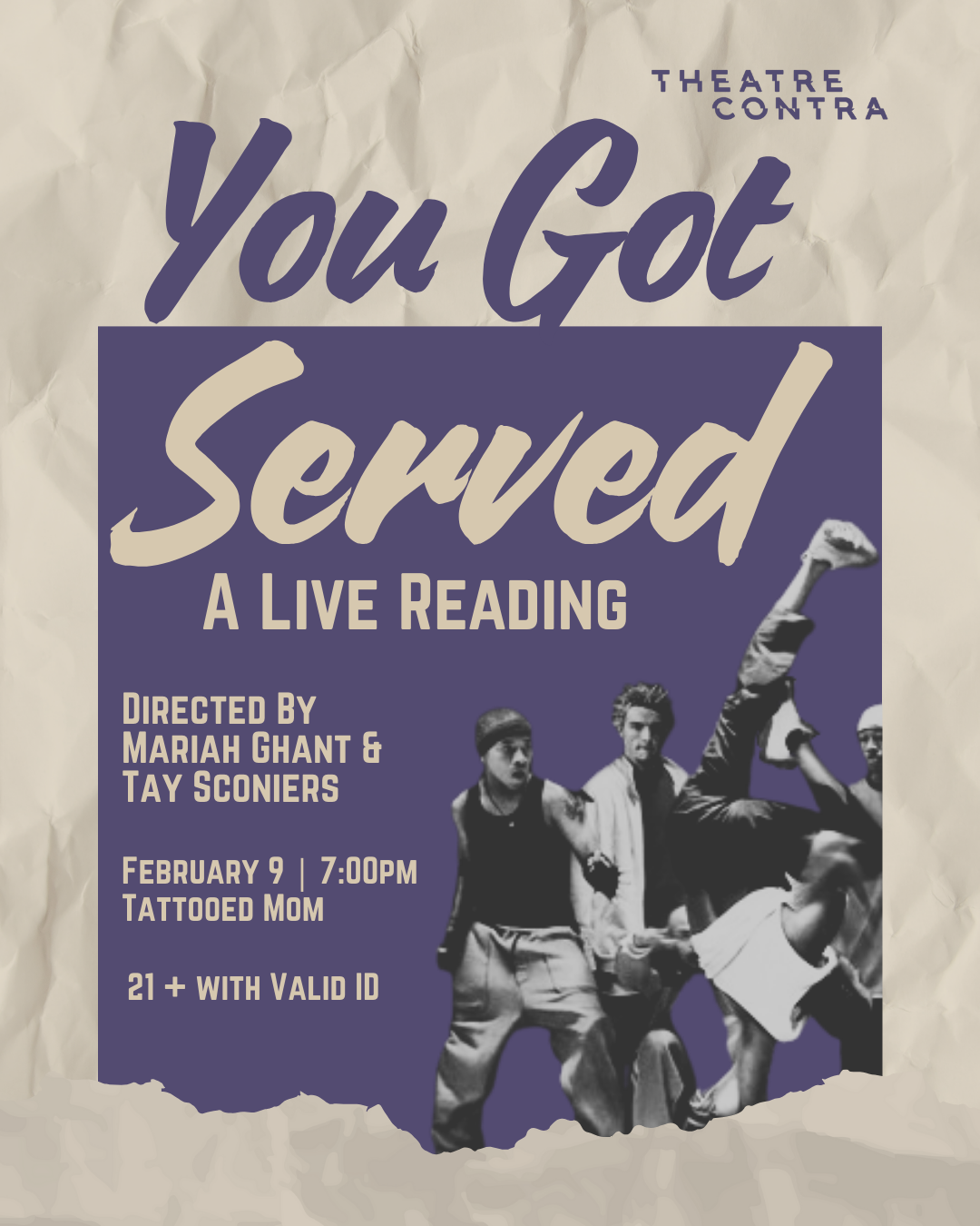 There’s ONE true dance showdown film, and that’s YOU GOT SERVED! That’s right — Theatre Contra is taking the iconic script of this dance movie classic and bringing it to life onstage! Crews will clash, friendships will be tested, and somebody is absolutely getting served - because in this game, respect is earned eight counts at a time.